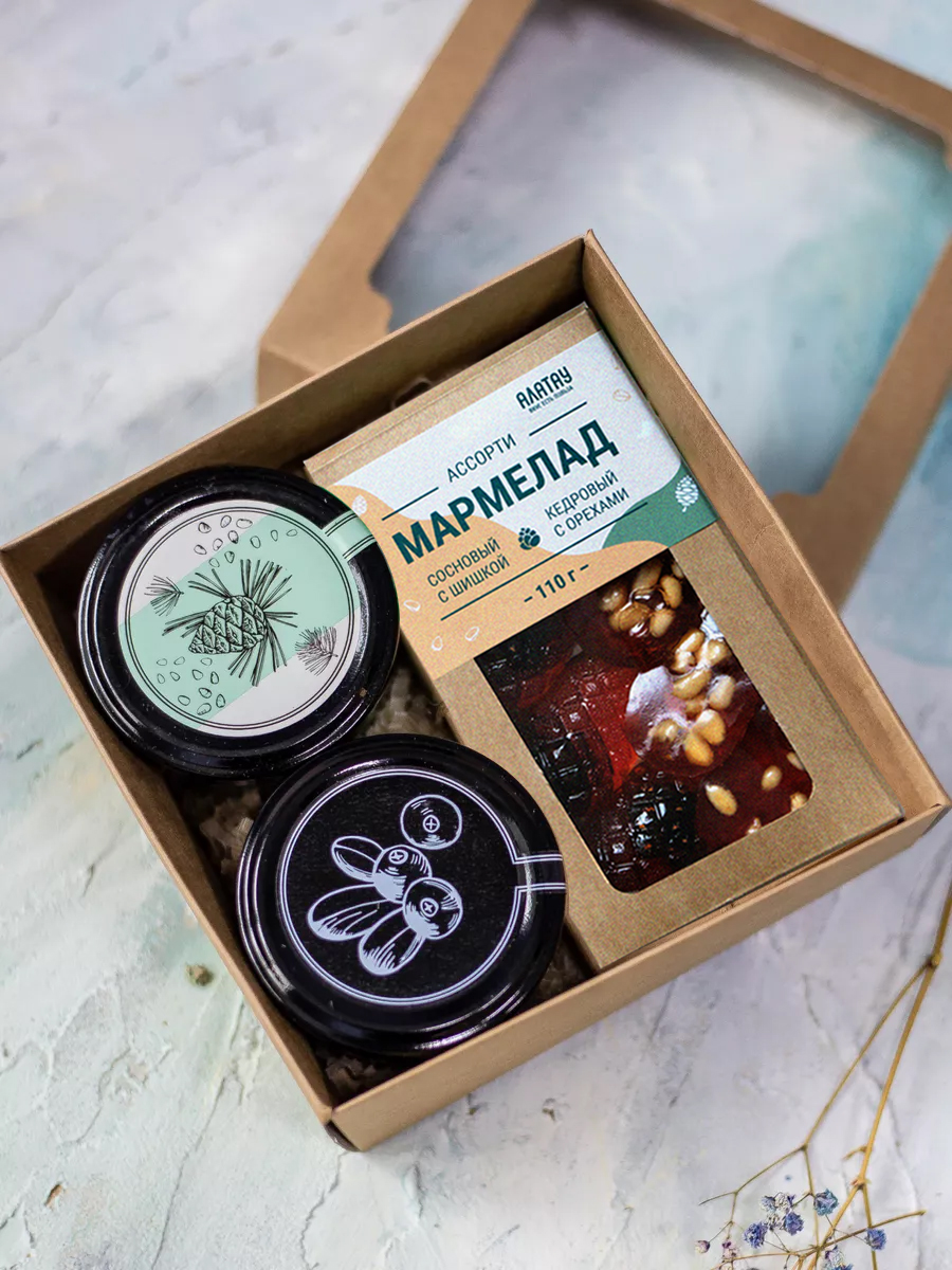 Варенье из сосновых шишек с кедровым орехом - 100 мл; Клюква в сосновом сиропе - 100 мл; Мармелад с сосновой шишкой - 110 гр